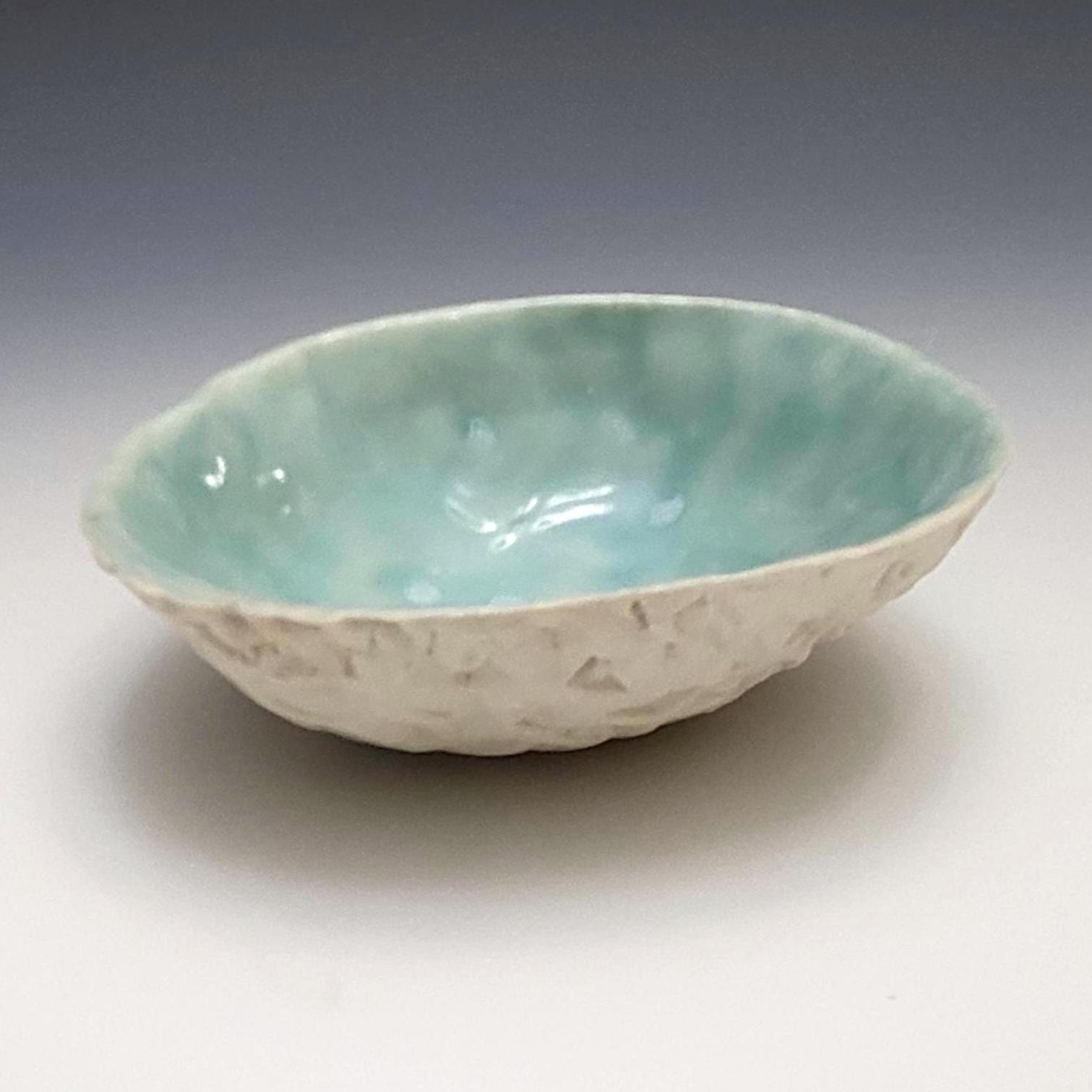 This little bowl has carving on the outside and glossy turquoise blue glaze on the inside.