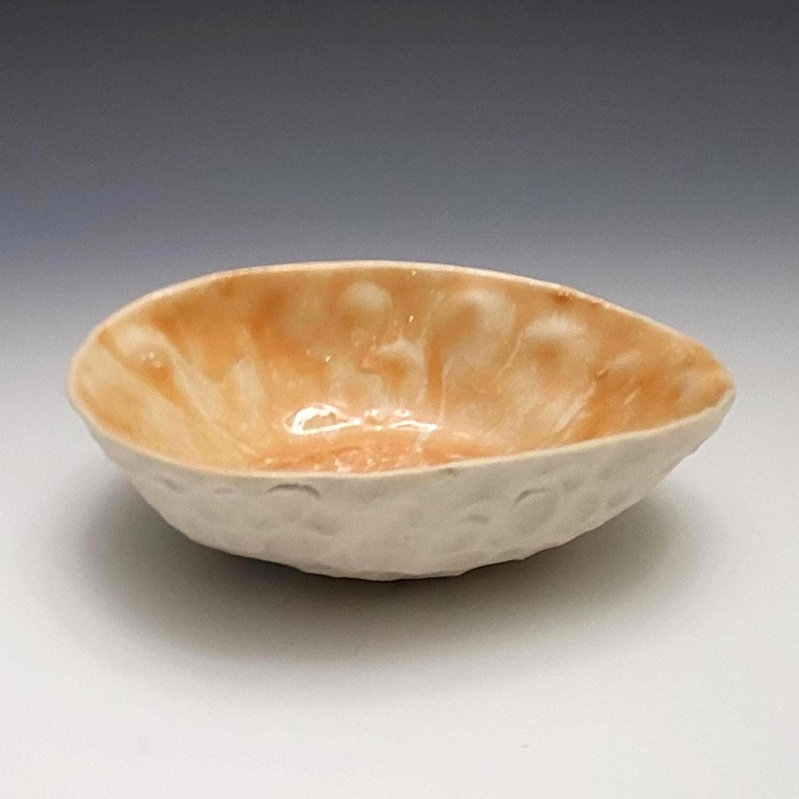 This little bowl has carving on the outside and glossy orange glaze on the inside.