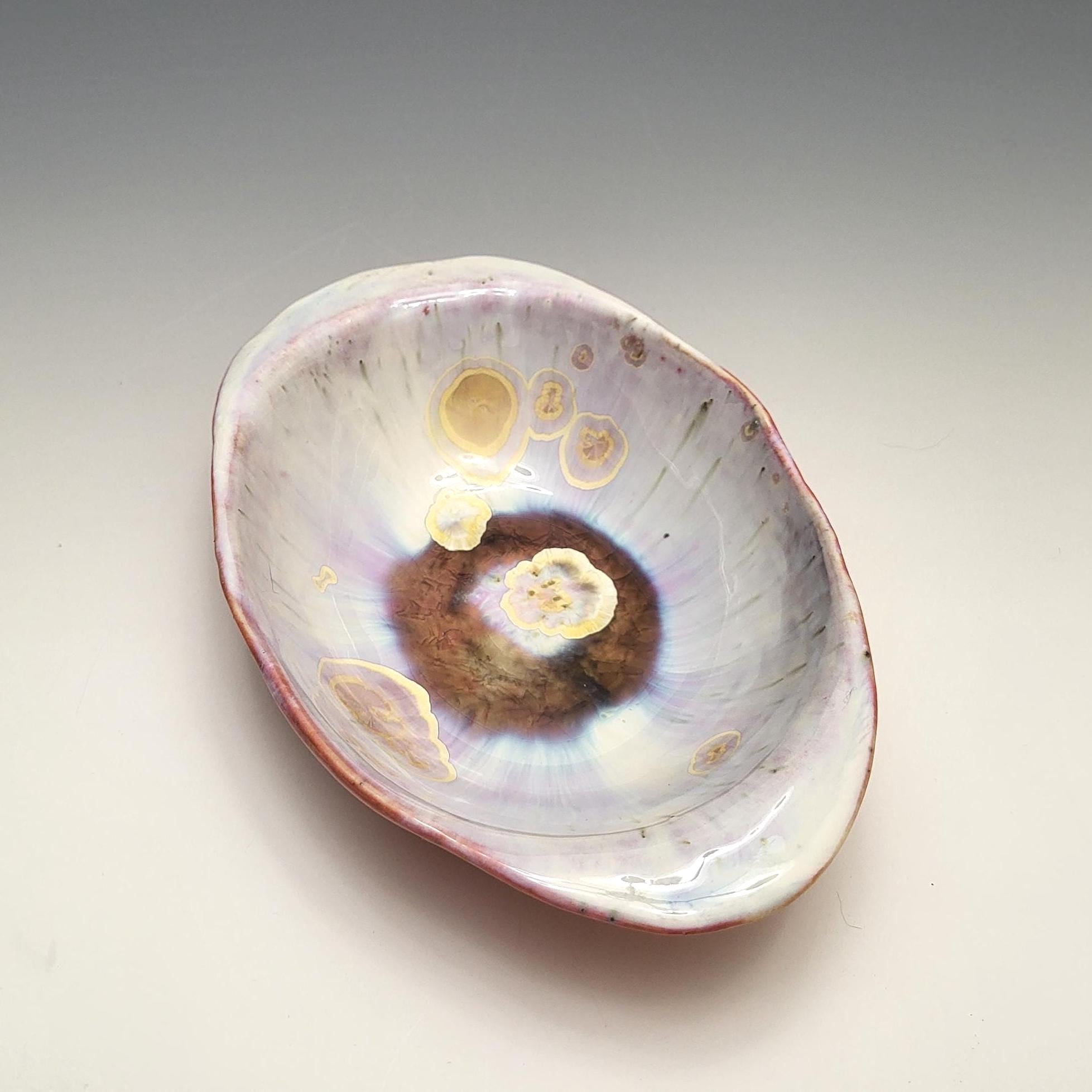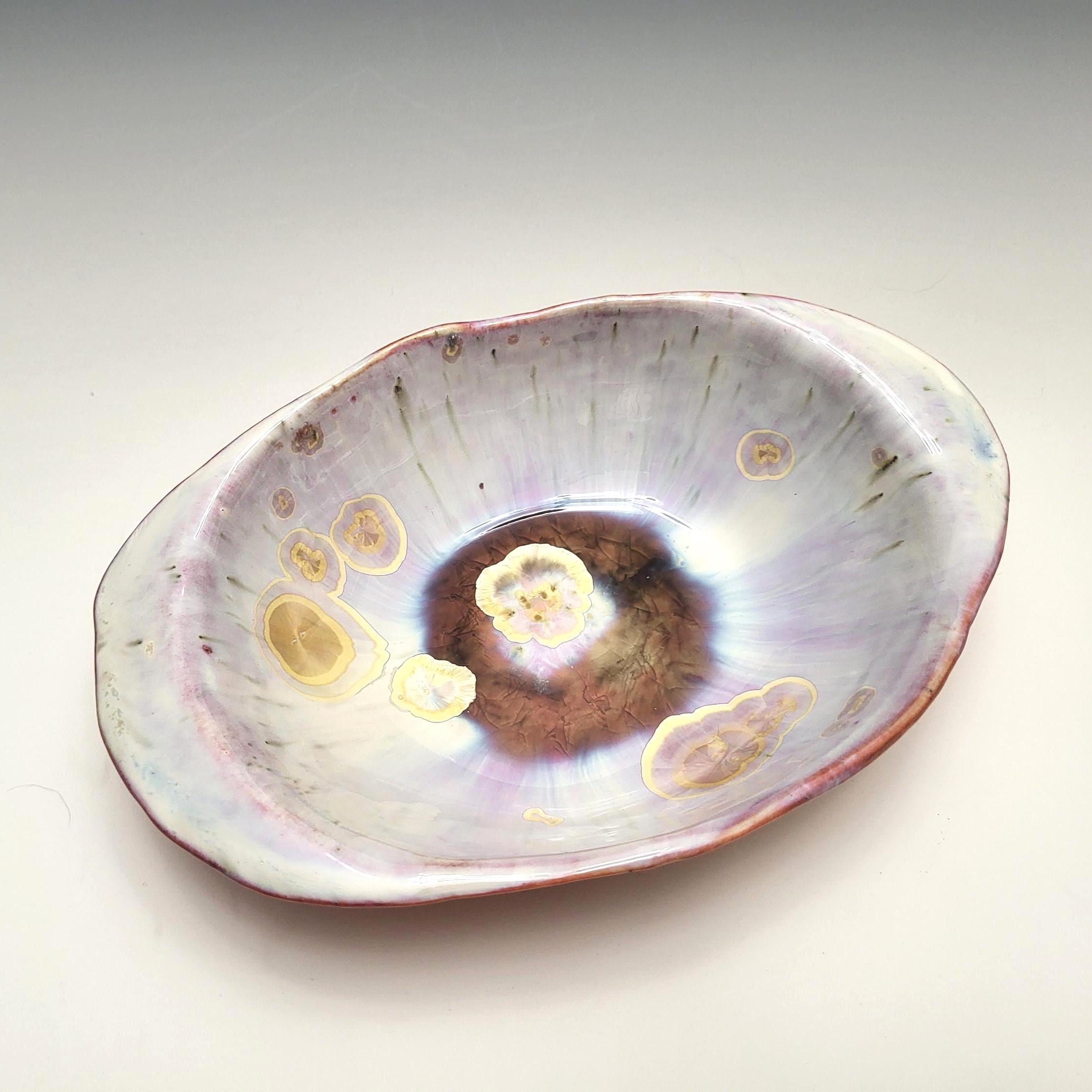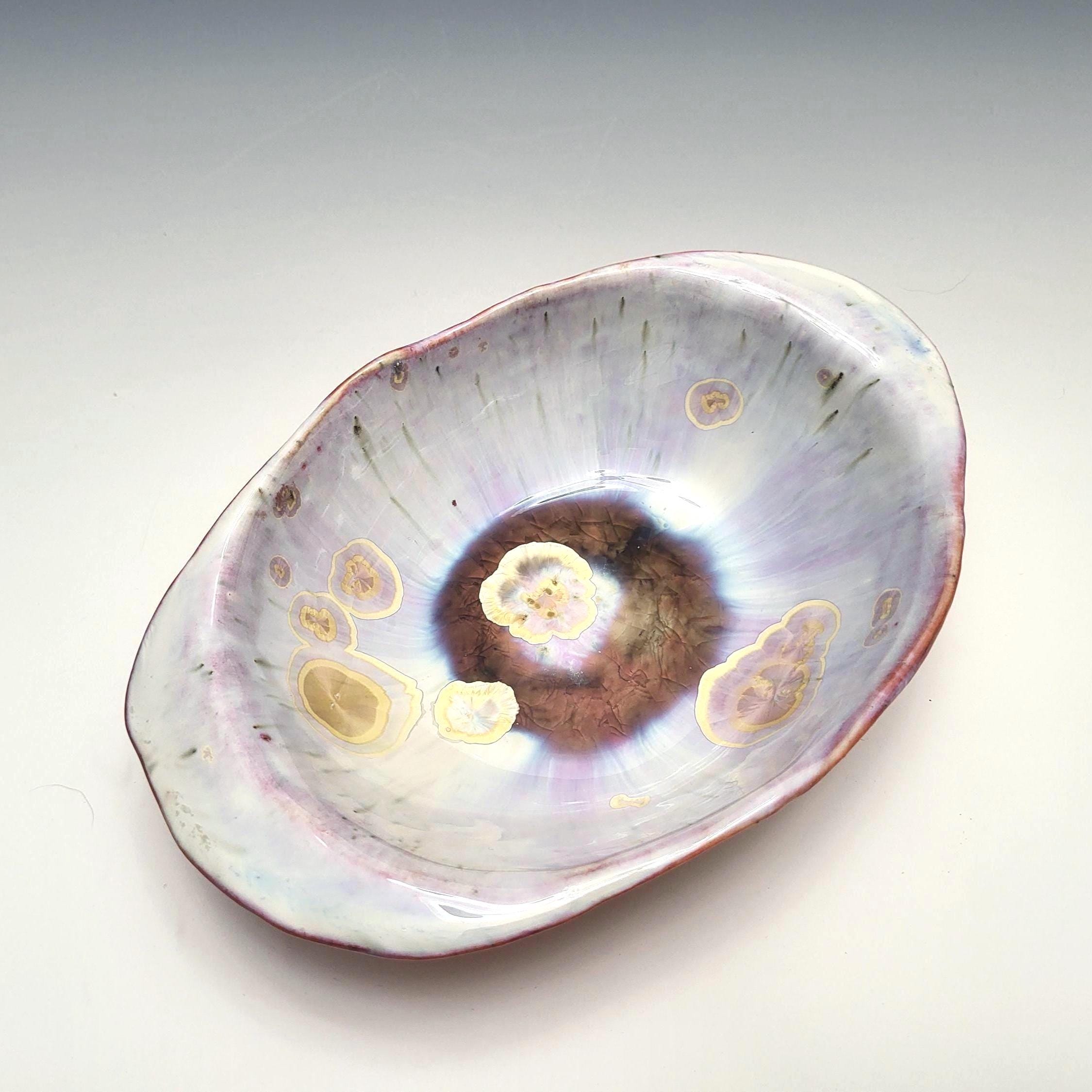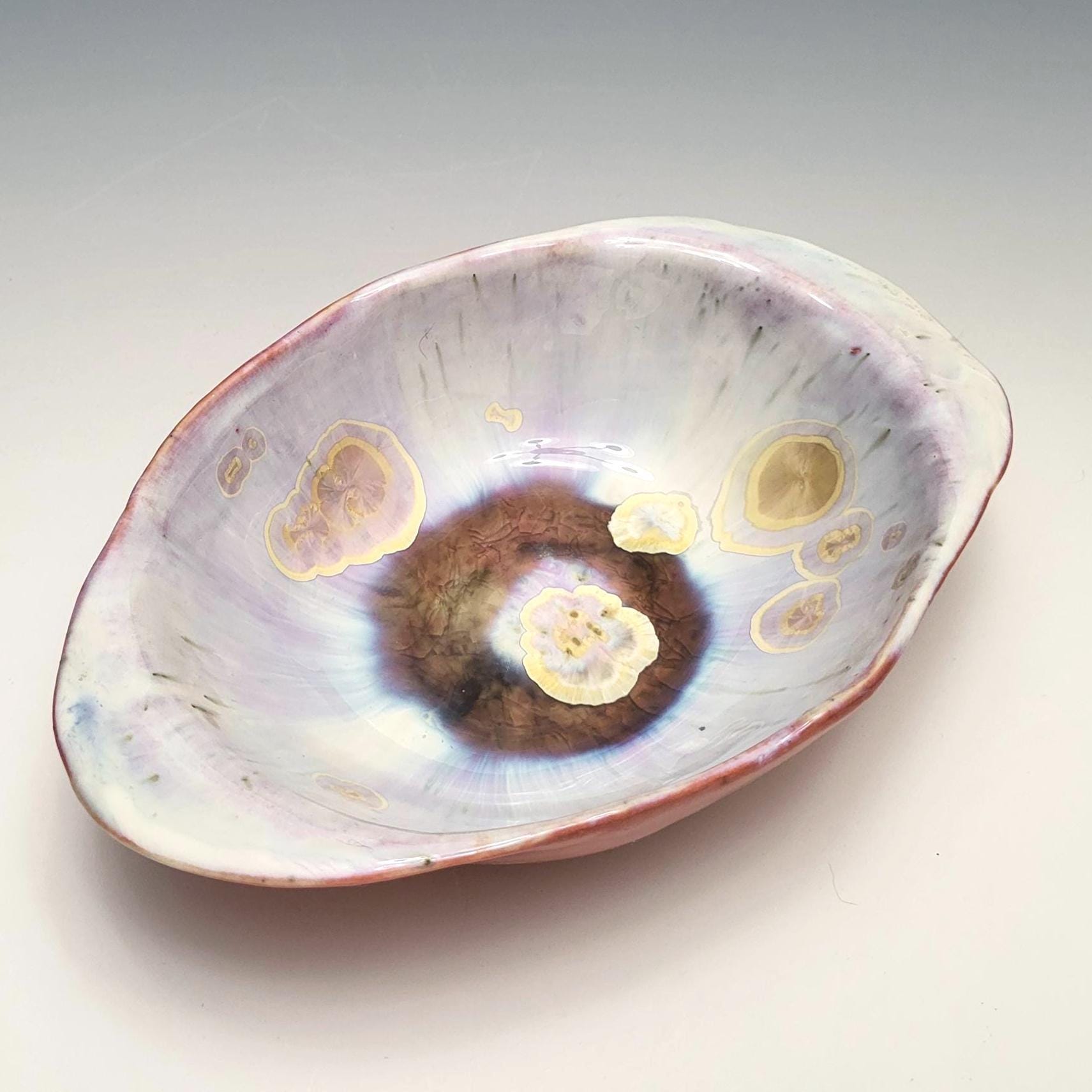 Crystalline glazes are formulated special to grow these crystals in the glaze. When all the conditions are perfect, these crystals will grow at about 2000 degrees Fahrenheit. With this type of glaze, no two pieces will ever come out the same, and therefore you can’t ever duplicate any one piece.