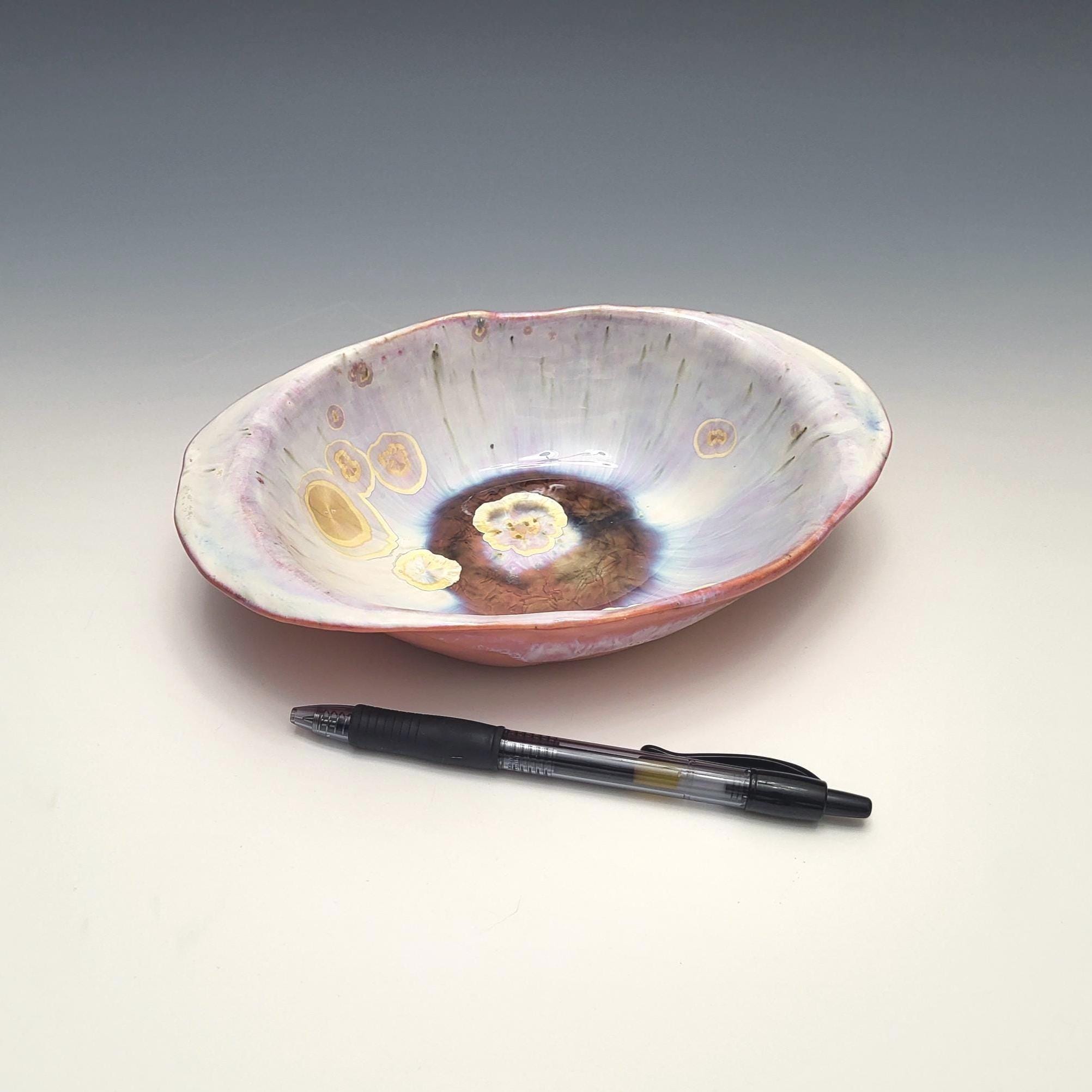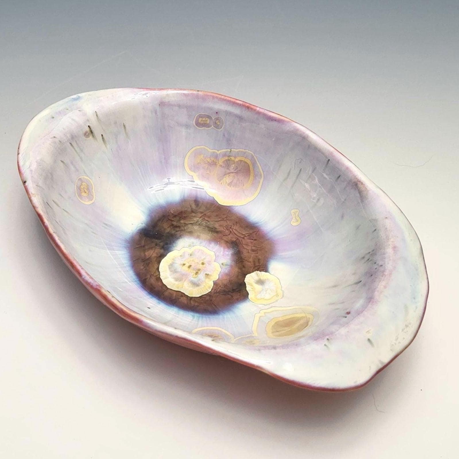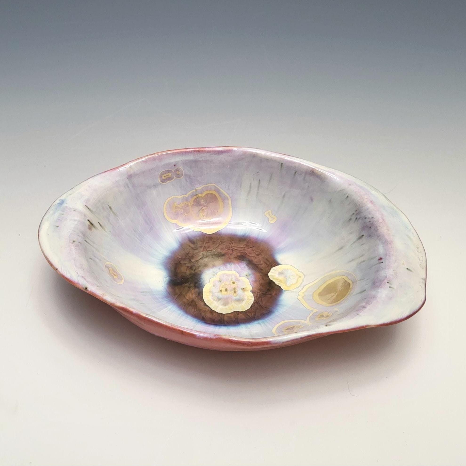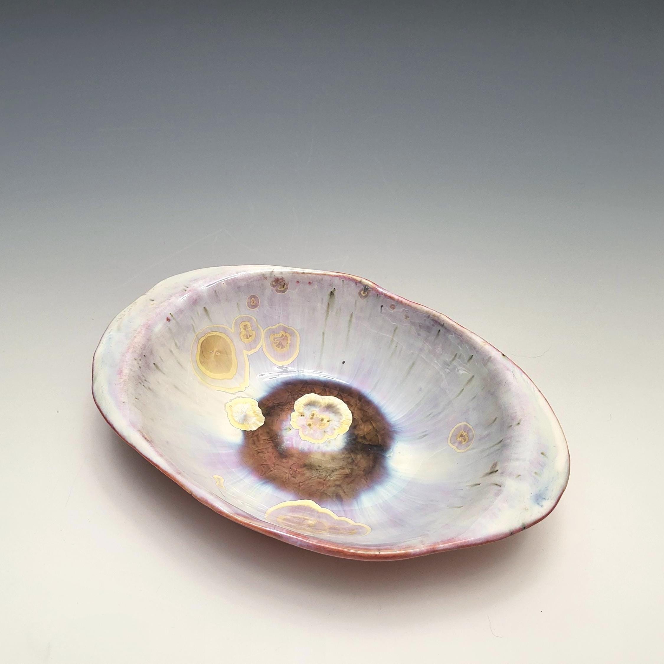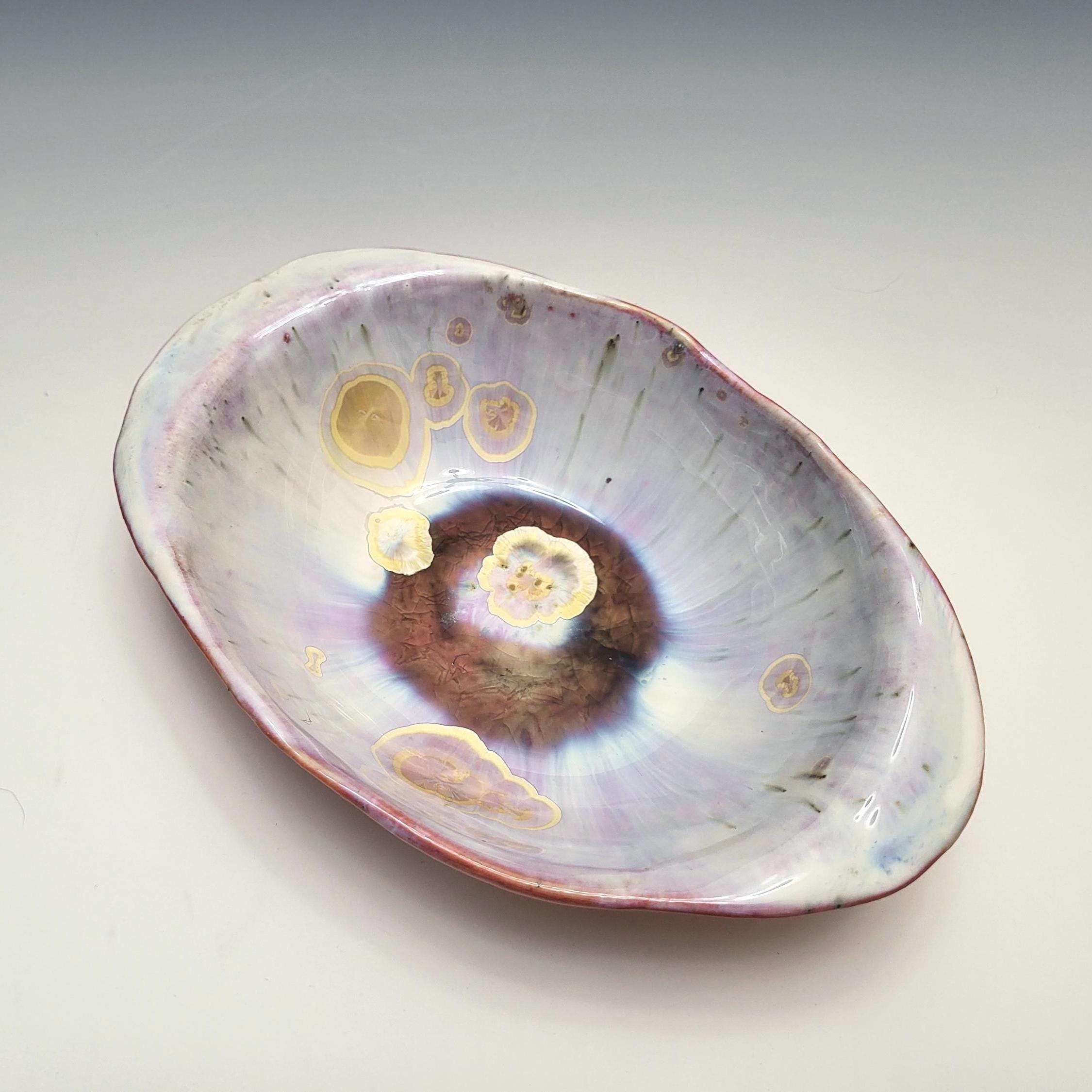 Crystalline glazes are formulated special to grow these crystals in the glaze. When all the conditions are perfect, these crystals will grow at about 2000 degrees Fahrenheit. With this type of glaze, no two pieces will ever come out the same, and therefore you can’t ever duplicate any one piece.