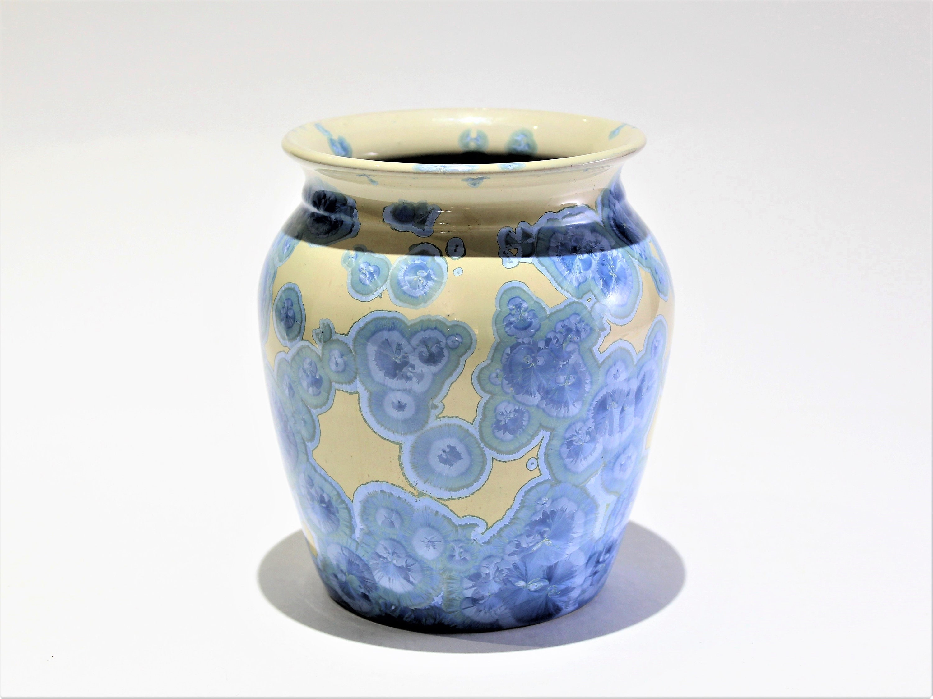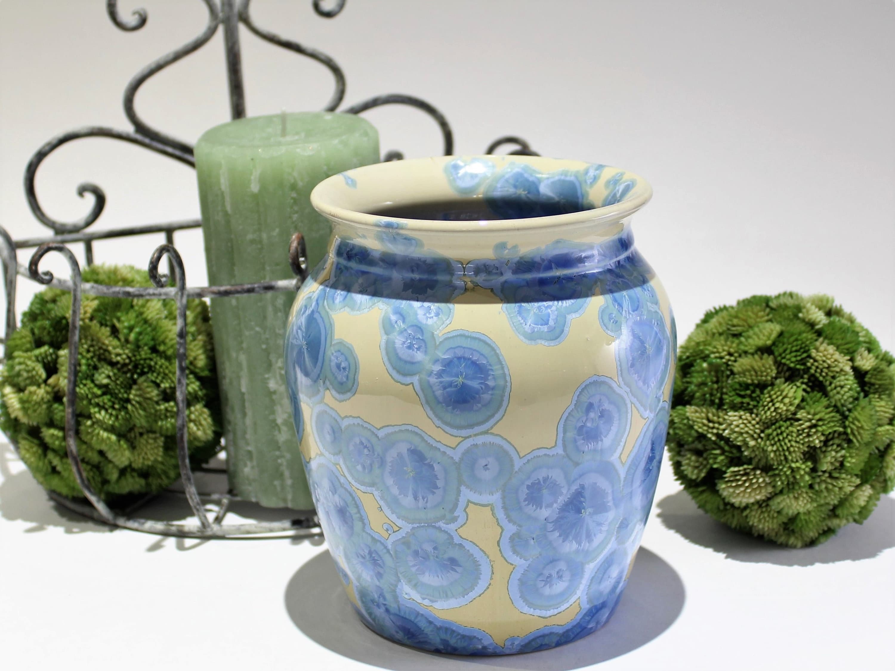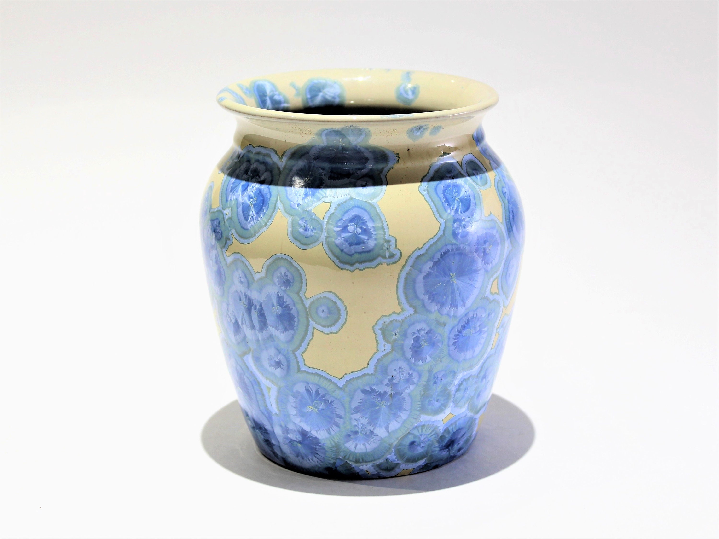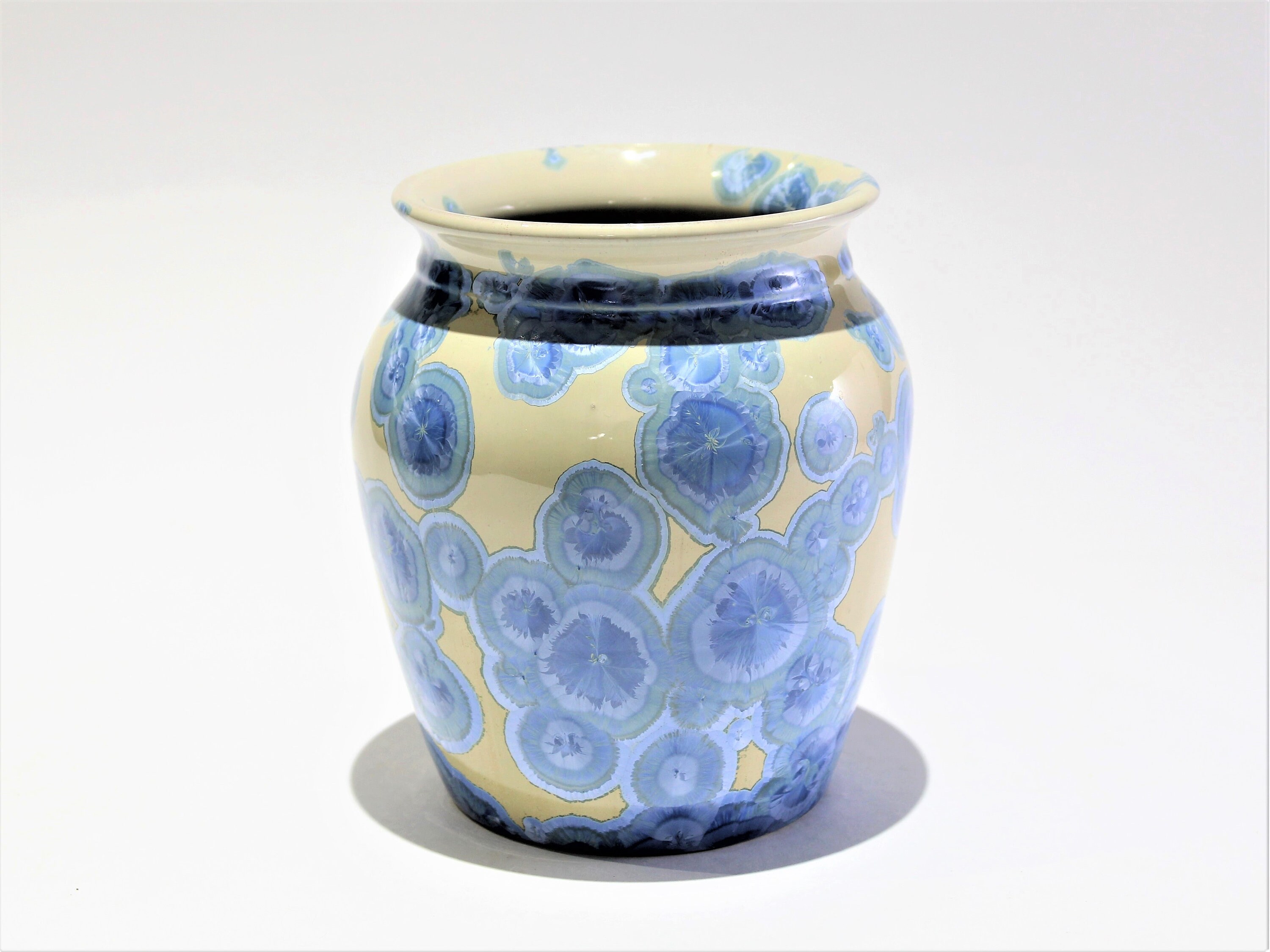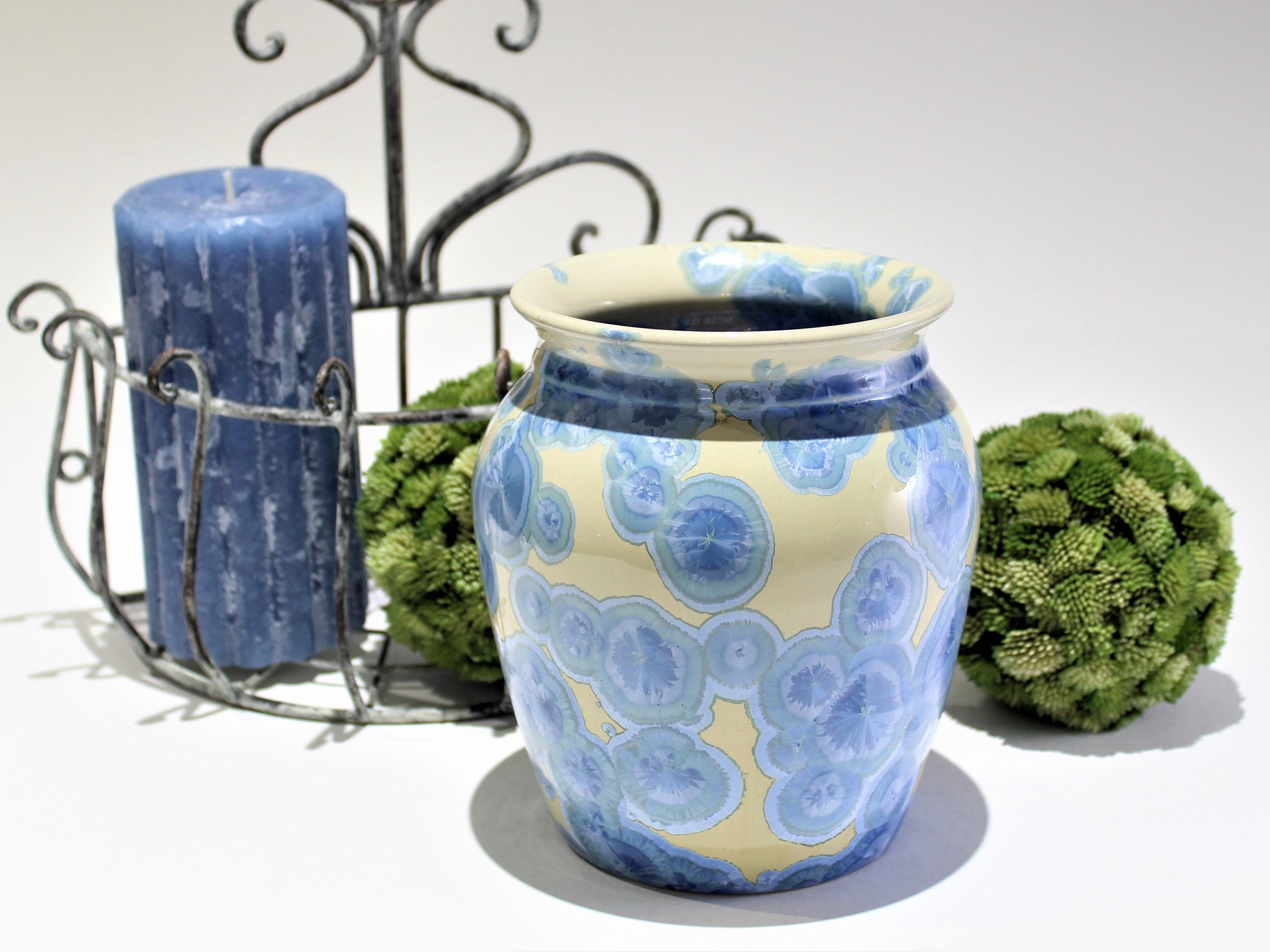 This large handmade Crystalline Glazed vase has beautiful blue crystals, each side is different, including the inside.